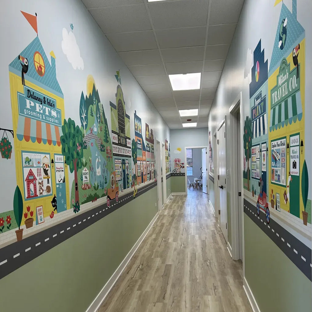 Each mural theme is custom designed, colorfully illustrated and made to fit perfectly for your business space, from town to country to sea. Christy's playful style and cute happy animals create a storybook world to inspire creativity and fuel imagination.