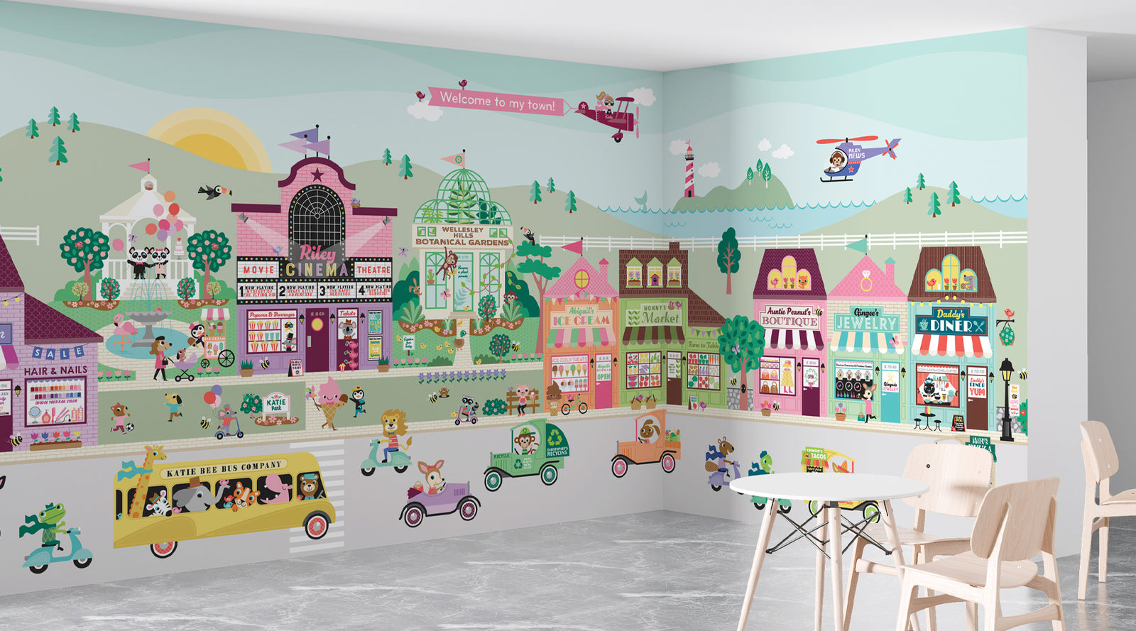 Looking to enhance your children's business with one of our adorable one-of-a-kind wallpaper murals or need assistance designing a layout for your space using our wall decals? We can custom design and create a special wall covering sized perfectly to fit your large commercial space and personalize the artwork to your specific needs. Contact us and we will be happy to discuss your project!