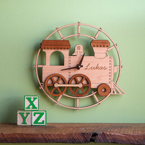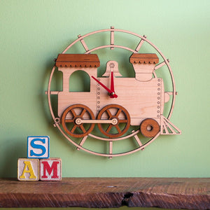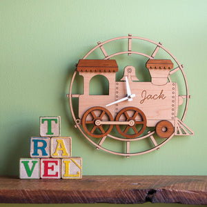 Add your child's name for a personal touch on our Train Wooden Wall Clock! Handmade from maple and cherry wood, this clock features an adorable original train design with a cleverly marked railroad track for the hours. Perfect for nurseries and train enthusiasts of all ages.