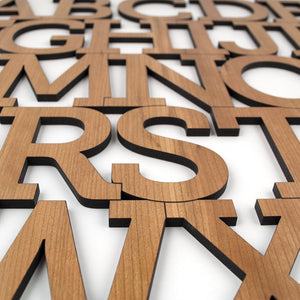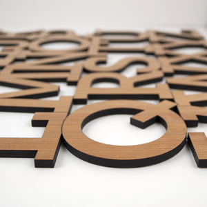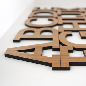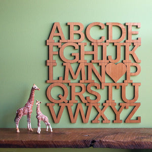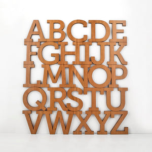 Our wooden Alphabet wall hanging is lovely decor for the ABC baby nursery theme. Perfectly balanced and symmetrical, this modern design works well in a kids room or office. Not only is every letterform precisely cut out, but each shape is also engraved to see where one letter stops and the other begins, just another detail that adds to the sophistication of our piece.